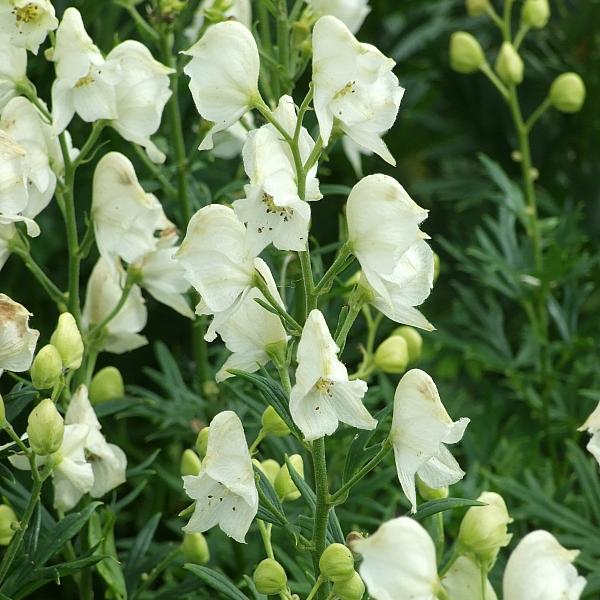 Саженцы Аконита (Борца) клобучкового Альбум (Album) привлекательны внушительными размерами, неприхотливостью и универсальностью. Травянистый многолетник одинаково хорошо растет на солнце и в тенистом цветнике. На прямостоячих прочных стеблях, высотой до метра, распускаются многочисленные белоснежные цветочки удивительной формы: верхние широкие лепестки соединены в подобие капюшона, нижние остаются раскрытыми. Размер каждого бутона не превышает 3 сантиметров. Цветение обильное, с июля по конец сентября.