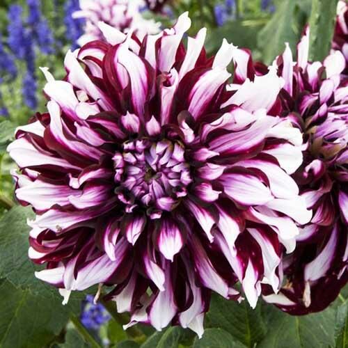 Луковицы георгины Декоративной Тартан (Tartan) любимы у садоводов за яркость, пышность цветения и внушительные размеры. Огромные соцветия бело-фиолетовой расцветки возвышаются на высоте 130 сантиметров над землей, что делает сорт одним из самых высоких. Растения заслуживают того, чтобы быть высаженными в парадной зоне участка для привлечения внимания к определенной зоне.