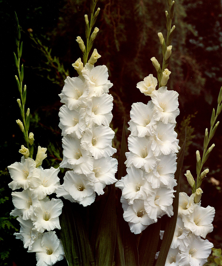 Луковицы гладиолуса гибридного Bangladesh высаживают в открытый грунт на расстоянии 20-25 см друг от друга. Сорт неприхотлив, хорошо растет как на солнечных, так и притененных участках. Вот только в тени цветение может быть не таким обильным. Стебли гладиолуса гибридного Bangladesh вертикальные, неветвящиеся, одиночные, в высоту достигают до 50-150 см. Листья линейные или мечевидные, насыщенно-зеленые. Цветки собраны в одностороннее или двустороннее колосовидное соцветие длиной до 80 см. Цветы классической формы, белоснежного окраса.