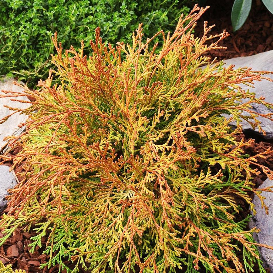 Саженцы кипарисовика тупого Камарачиба (Kamarachiba) превратятся в яркий декоративный карликовый куст с широкой кроной полукруглой формы. Хвоинки не острые, а притупленные, мягкие, откуда и пошло название вида. Ветки растут из центра лучами. Цвет хвои напрямую зависит от освещенности участка и влажности почвы. Хвоя золотистая, осенью темнеет до бронзового цвета. Не переносит известковых почв. Долговечен, живет более 200 лет.