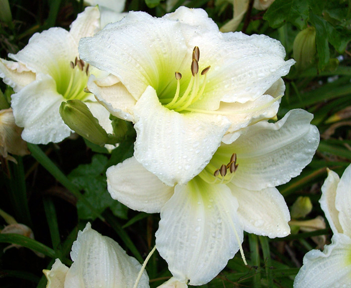 • обильное и продолжительное цветение. Распустившиеся бутоны имеют белоснежные лепестки с немного гофрированным краем и атласным блеском, горлышко при этом нежно-зеленного оттенка. Лилейник Джентл Шеферд прост в уходе, что нисколько не уменьшает красоты этого растения. Взрослый куст имеет обильную листву и множество цветоносов, что создает ароматное цветочное облако.