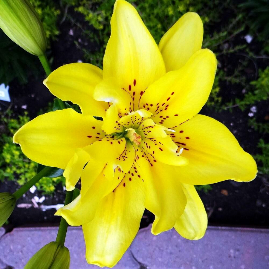 Окраска цветка : Цветки чашевидные, махровые (12 лепестков), ярко-желтые, ближе к центру единичный мелкий крап