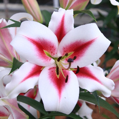 • Окраска цветка : белый с насыщенно-малиновыми мазками из центра и темными пыльниками