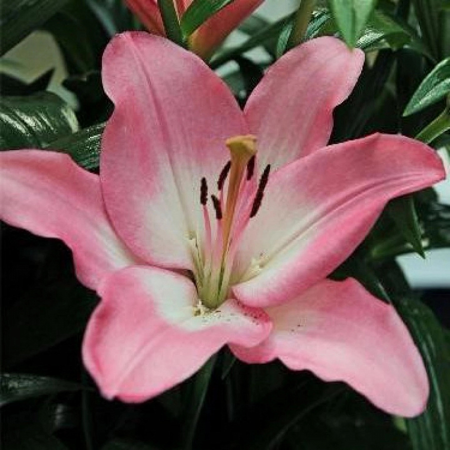 Окраска цветка : Перламутрово-розовая с белым центром, темно-розовые пыльники и редкий мелкий крап у основания