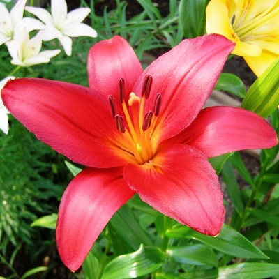 Саженцы и рассада Лилии ла-гибрид Лаксми (Lilium la-gibrid Laksmi) обязательно пригодятся желающим добавить красок в свой сад, обратить внимание на территорию перед домом или офисом. Декоративное многолетнее растение высотой до 110 см, с большими ярко-красными глянцевыми цветами диаметром до 20 см, обязательно привлечет восхищенные взгляды прохожих. Период цветения начинается в середине июля, почва предпочтительная для посадки должна быть рыхлой, песчано-глинистой, хорошо пропускать влагу. Растение морозостойкое, на зиму не требует укрывания, для лучшего цветения на следующий год можно осенью промульчировать компостом, на одном месте растет 3-5 лет.