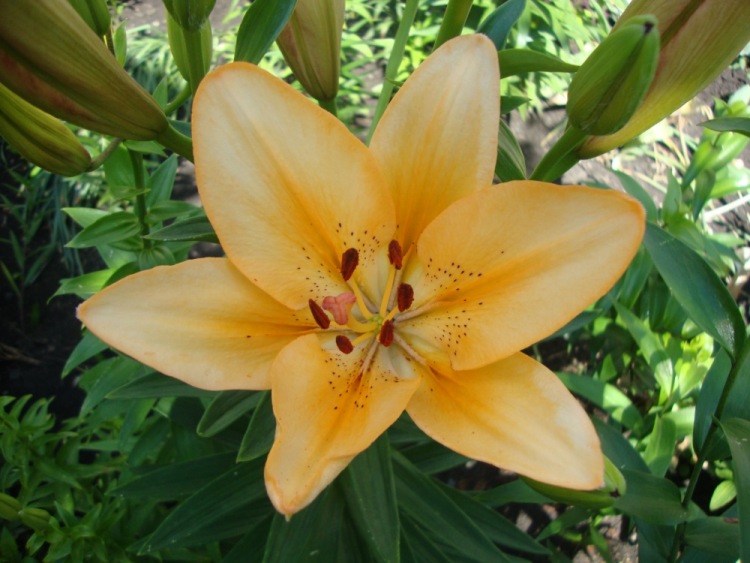 Луковицы лилии ЛА-гибрид Ройал Тринити (Lilium LA-hybrids Royal Trinity) при весенней посадке могут зацвести в первый год. Стебли растений этого сорта на теплых солнечных местах или в полутени вырастают до 120 см. Цветки, которые появляются во второй половине лета, имеют диаметр 16-18 см, нежную желто-оранжевую расцветку лепестков и коричневые пыльники. ЛА-гибриды неприхотливы в выращивании и зимостойки. Хотя не все растения данной категории имеют запах, сорт Ройал Тринити относится к разновидностям с сильным ароматом. Эти лилии станут настоящим украшением вашего сада.