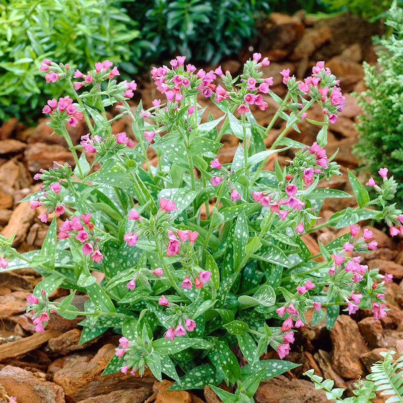 Рассада медуницы "Распберри Сплэш" (Raspberry Splash) предпочитает тень, но способен расти и на хорошо освещенных местах.Хорошо себя чувствует на богатых гумусом, влажных почвах. Сорт особенно ценится за декоративные листья. Они темно-зеленые узкие, вытянутые, густо усыпанные серебристыми пятнами разного размера. Цветы окрашены в манжетово-розовый цвет. Высота взрослого растения не превышает 30 см. Рассада медуницы "Распберри Сплэш" хорошо осмотрится как в бордюрах, так и различных миксбордерах и групповых цветниках. Идеально подходит для создания яркого переднего плана.