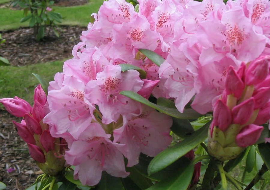 Рододендрон Helsinki University - Сорт был выведен в Финляндии в 1974 году и назван в честь 350-летия университета Хельсинки. Считается самым зимостойким из всех рододендронов в условиях северо-запада России. Он способен выдерживать холод, повышенную влажность, экстремально низкие температуры, а также ее перепады. Цветение начинается в начале июня, и обильно цветут даже молодые растения. Цветки воронкообразные (до 7,5см), нежно-розовые с тёмно-красными крапинами на верхнем лепестке, со слегка волнистыми краями, в соцветиях по 12-18 шт. Прекрасно растет и цветет не только в полутени высоких деревьев, но и достаточно плотной тени зданий. Морозостойкость цветочных почек очень высокая, поэтому данный сорт цветёт обильно даже после суровых зим. Диаметр кроны взрослого растения - 1.5 м, высота куста - 1.7 м. Листья эллиптические, тёмно-зелёные, блестящие, длиной до 15 см. Вечнозеленые сорта рододендрона получены селекционным путем и поэтому их еще называют гибридными. Гибридный рододендрон очень популярен и славится своими декоративными качествами и морозостойкостью. Отличается длинными кожистыми листьями, большими цветами, почти всех возможных оттенков, в зависимости от сорта. Цветёт в мае и июне.