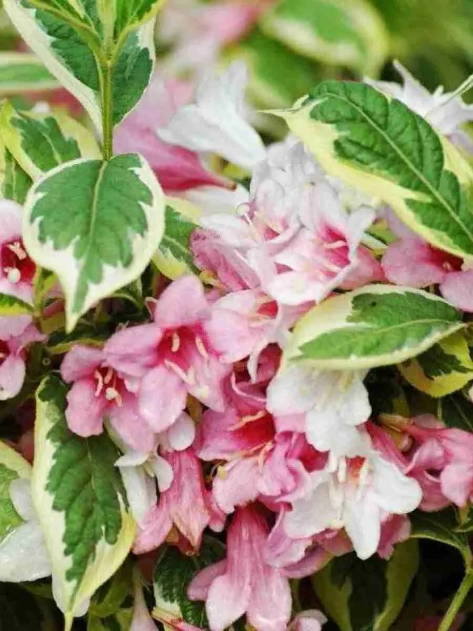 Саженцы Вейгелы цветущей Вариегата (Variegata) вырастают в один из наиболее красивых кустарников в своем роде, благодаря прекрасным бело-розовым или малиновым цветкам, растущим по несколько штук. Отличительным признаком листьев является наличие желтой каемки по краям. Крупномеры растут достаточно медленно и не достигают больших размеров – не более одного метра в высоту. Лучшим вариантом является посадка в садах, в которых преобладает каменистая почва. Характеристика Вейгелы цветущей Вариегаты:
